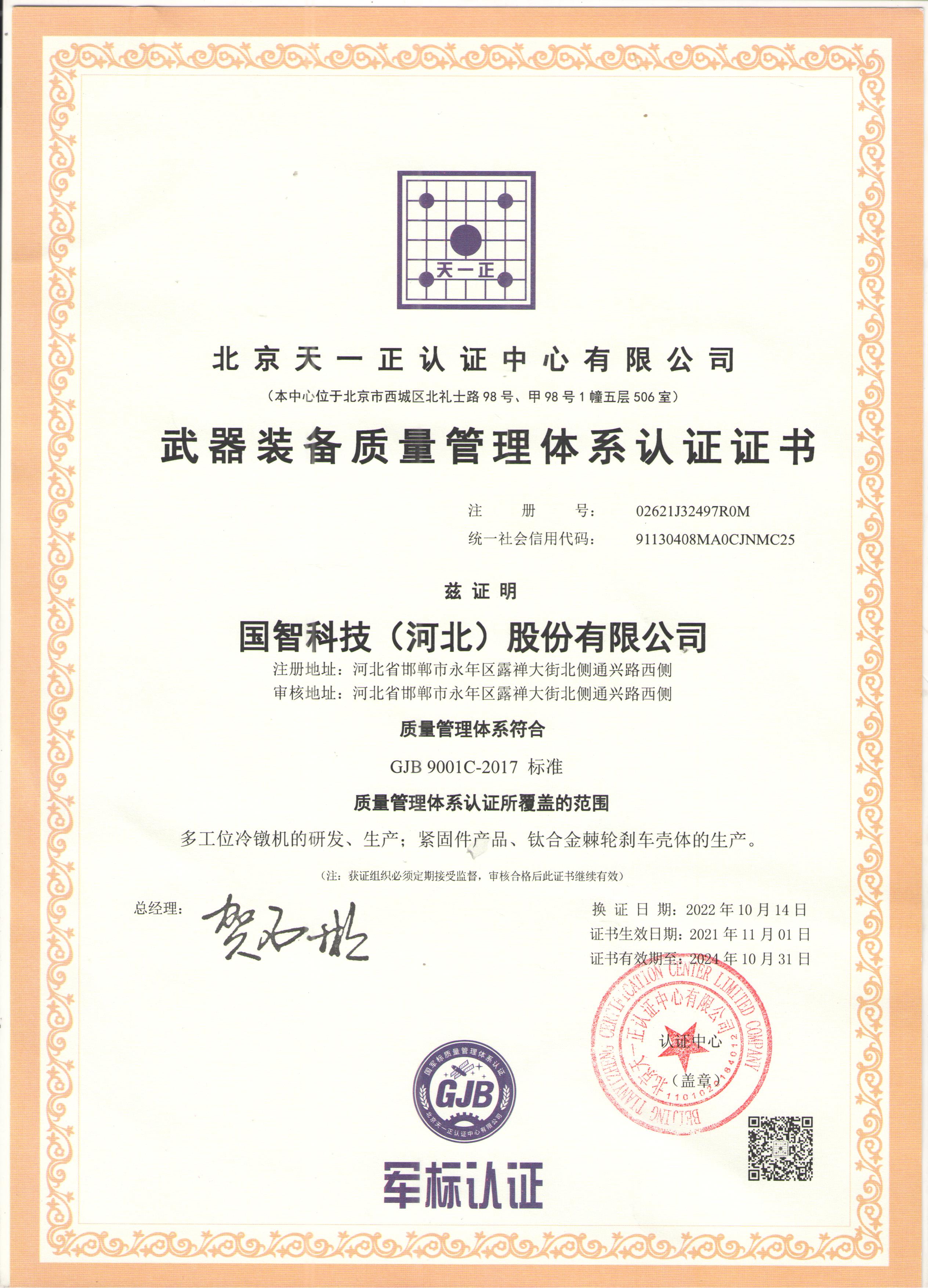武器装备质量管理体系认证证书